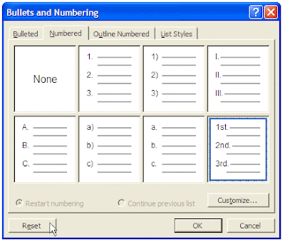 | Fig: Bullets and Numbering dialog box showing the Reset button |