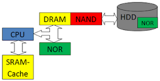 Как правило, NOR-память содержит команды инициализации процессора. На это есть свои причины, которые мы рассмотрим позже. Обычно мы работаем с жестким диском. Процессор не может напрямую с ним работать, ему нужна некоторая помощь. В памяти NOR хранится управляющая процессором программа, которая, говорит ему, что делать дальше. Память NOR энергонезависима и довольно быстра (среди энергонезависимых), поэтому программу инициализации процессора лучше всего хранить в NOR-памяти. Однако в качестве буфера она использоваться вряд ли может. Самая главная причина заключается в том, что отношение стоимости памяти к ее размеру крайне велико. Да и скорость ее не так велика по сравнению с DRAM.