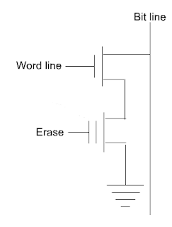 Ячейка EEPROM состоит из двух транзисторов: один с плавающим затвором и еще транзистор для снятия данных. Стирание данных производится непосредственно подачей потенциала на затвор транзистора памяти, а чтение — на транзистор снятия данных.
