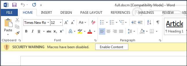 Современные версии Microsoft Office еще более строгие. Office 2013 настроен на отключение всех макросов по умолчанию с уведомлением о том, что запуск макроса запрещен.