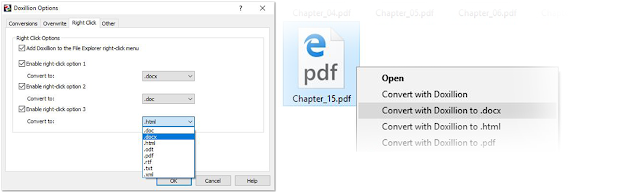 Doxillion will attach an option to the right-click menu on your computer when you first install the program. This allows you to simply right-click on a file on your computer and select Convert with Doxillion to automatically launch the program with that file locked and loaded and ready to be converted. You can also visit the options menu in the program and use the Right-Click tab to choose specific one-click conversions that you would like to have appeared in your tooltip. If you need to change PDF to DOC or DOCX often, set these as right-click options and simply right-click on any PDF file on your computer and select Convert with Doxillion to .doc. The converted file will appear in your chosen default output folder.