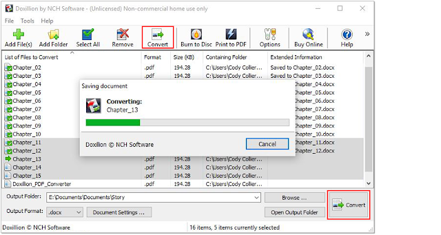 Once you have your PDF files imported into Doxillion, your output file type set and you have chosen your output destination, you are now ready to convert your PDF files to Word Documents. Click on the Select All button, located at the top of the program, to select all of the files currently in Doxillion. If you wish to only select a few files to convert, hold down the Ctrl key while selecting just those files. With your PDF file or files selected, click on one of the two Convert buttons in the program to start the conversion process.