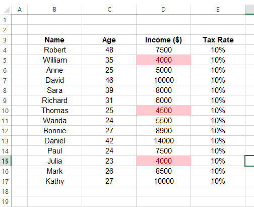 Two conditional formatting criterias are applied to this worksheet. First one is applied to range C4:C17 and second one is applied to range D4:D17. Cells are highlighted in yellow color in C4:C17 range if the cell value is greater than 40. And cells are highlighted in light red color in D4:D17 range if the cell values are less than 5000.
