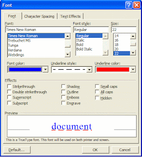 This post discusses extensively what character formatting entails. You will learn how to perform character formatting tasks such as changing the font, font style, size, color, and other effects and animations, using the Format menu, formatting toolbar or shortcut keys. Characters are letters, numerals, spaces, punctuation marks and symbols entered from the keyboard/onscreen keyboard (such as @, #, %, & and *) or symbols inserted into the document from the Symbol dialog box or the Character Map (such as ®, ™, φ. ♥, ♫, », Ø, Σ, ∫, ∏, Φ, ☺, ≤, ∞, Ω, №, ß, etc). Character formatting in Word has to do with applying formatting properties to enhance the appearance of individual text characters. Character formats can be applied to a single character, word, sentence or a line of text, without such formatting affecting the entire current paragraph. Examples of character formats that can be applied to text characters in Word include those you find in the Font dialog box (such as bold, italic, underline, font, size, color, superscript, subscript, scaling, animation effects, etc), highlight, change case, etc. To apply a character format to a character or a set of characters, you need to specifically select the desired amount of characters and then apply the formatting you want. The following sections provide you extensive instructions on how to format text characters in Word. Change Font Font is referred to as the typeface for typed text. In a lame man’s language, it can be called ‘handwriting’. In real life, people scribble in unique handwritings characterized with different looks, sizes, intensity and spaces. Font is the electronic version of such handwritings. |