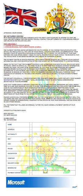 Below is another example of a fake lottery scam is really amazing, this one uses the name «MICROSOFT WORD CORPORATION LOTTERY. » This is truly one of the most pathetic attempt fraud I have ever seen. The scammers even placed as Microsoft motto: «Fighting Poverty Around the World». For one of the largest and most voracious of the earth.