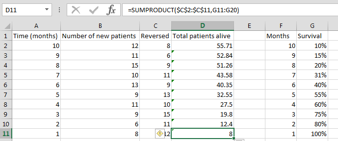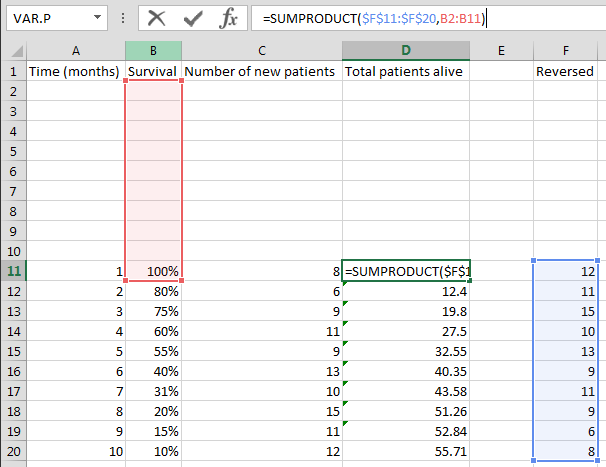 I have been able to use VBA to code the survival of the number of new patients column (C). But then I would have to rerun the VBA code as soon as I change a single value in that column.