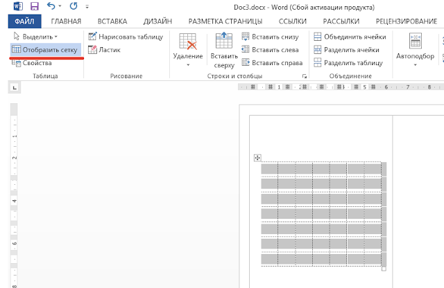 Вся табличка станет расчерчена как бы пунктирчиком. Если у вас границ нет совсем, значит нужно включить отображение границ — во вкладке Макет в левом углу есть кнопочка Отобразить сетку. Жмем на неё и наслаждаемся видимыми границами)))