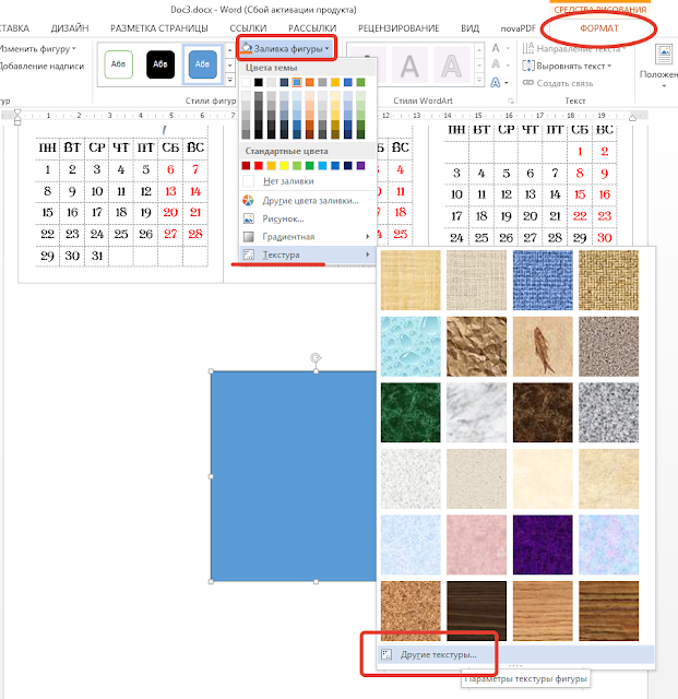 А затем вместо заливки фигуры по умолчанию цветом выбираю заливку текстурой. Из предложенного списка нам ничего не надо поэтому жмем в самом низу — Другие текстуры