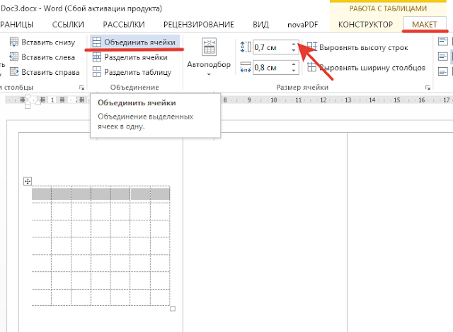 Теперь работаем со вложенной табличкой — в верхней строке у нас будет название месяца, поэтому ячейки в ней мы объединяем и произвольно добавляем высоту строки (это можно будет потом скорректировать, так что пока неважно сколько точно будет) Не забываем перед всеми манипуляциями выделить все ячейки верхней строки.