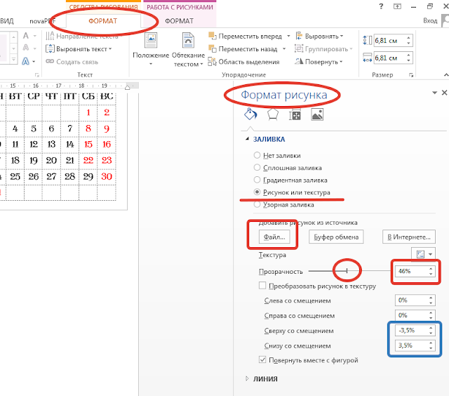 И наконец-то мы видим в появившемся сбоку меню вожделенную прозрачность))) Выбираем пункт Рисунок — показываем файл который нам нужно вставить. Здесь же задаем прозрачность — просто двигая ползунок. Я остановилась на 46%