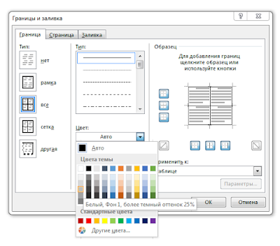 крестика в верхнем левом углу таблички, открываем диалоговое окно (ДО) Границы и