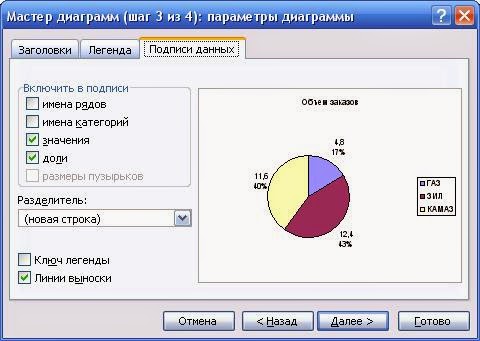 Выделяем столбцы с заголовками (Тип а/м и Объем заказов), затем нажимаем на панели инструментов кнопку Мастер диаграмм.