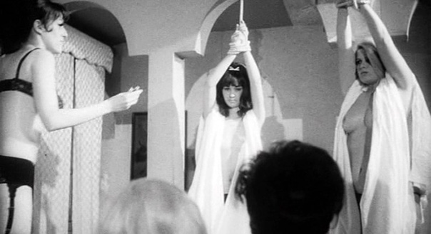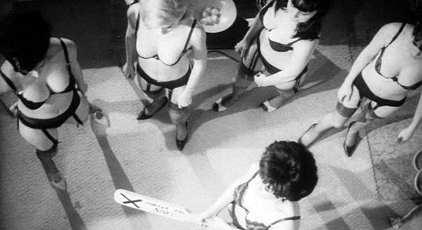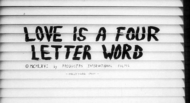 «Love is a Four Letter Word», aka The Love Girls (1966) appears to be the first full-length film to show a fetishistic sorority initiation ceremony. The hazing includes bondage, blindfolds, ice rubbing, and hard spanking with a big sorority paddle. A sexploitation gem by Bob Cresse and R. L. Frost. They specialized in harsh grindhouse «roughies», but this obscure film is more of a dark psychological study of repressed desire.