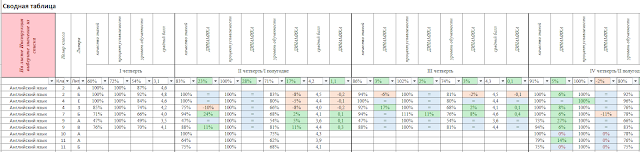 - Один учитель вводит в шаблон предметы, которые преподаёт, классы, количество учащихся, количество 5, 4, 3, 2 по всем четвертям, полугодиям и за год. Проценты качества и успеваемости, уровень обученности и средний балл вычисляются автоматически по всем предметам. Учитель на отдельном листе может проследить динамику изменения этих значений. Отрицательная, положительная и стабильная динамики выделяются цветом.