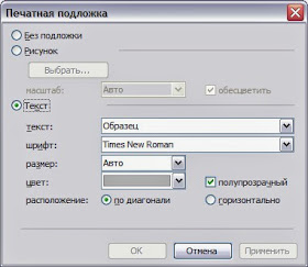 Выбрав пункт «Рисунок», Вы сможете в качестве подложки установить изображение, хранящееся у Вас на компьютере. Выбрав пункт «Текст», сможете установить в качестве водяного знака необходимый Вам текст. После того как все сделано, смело жмете «Применить»