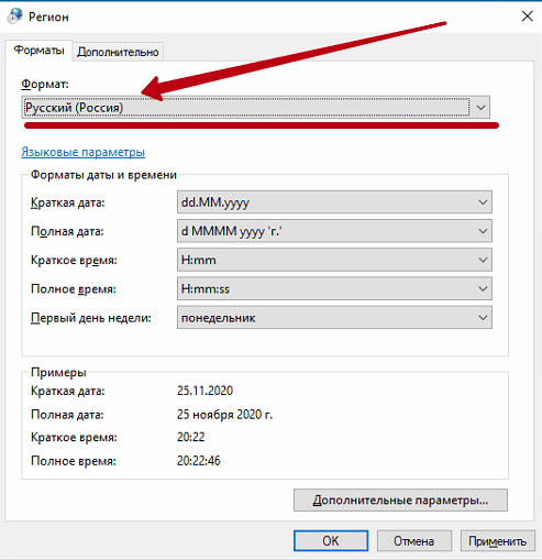 3) Если при установке Microsoft Office вы выбираете русский язык, то выставляем в «Формат» «Русский (Россия)». Нажимаем применить.
