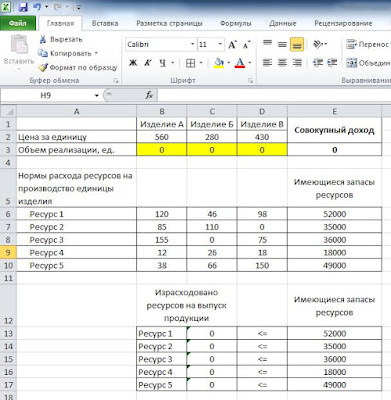 Также, в ячейках С13:С17 рассчитываются объемы ресурсов, необходимых для производства изделий каждого вида. Для этого нормы расходов ресурсов умножаются на соответствующие объемы выпуска продукции. Пока объем выпуска и реализации изделий равняется нулю, величина расходования ресурсов каждого вида также равняется нулю.