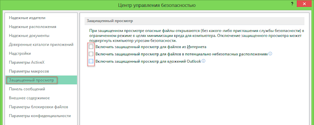 «Защищенный просмотр» — снимаем галочки со всех пунктов
