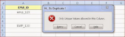 Suppose If you try to enter duplicate values in «EMP_ID» Column as «EMP_123» or «emp_123» in any cell Above or Below of already entered value «Emp_123» , then you will get the following “error alert” message.