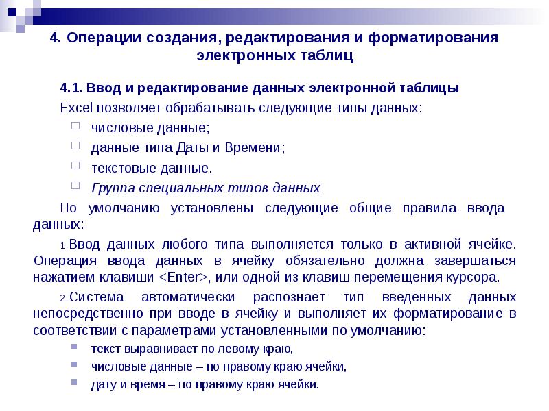 Система автоматически распознает тип введенных данных непосредственно при вводе в ячейку и выполняет их форматирование в соответствии с параметрами установленными по умолчанию: