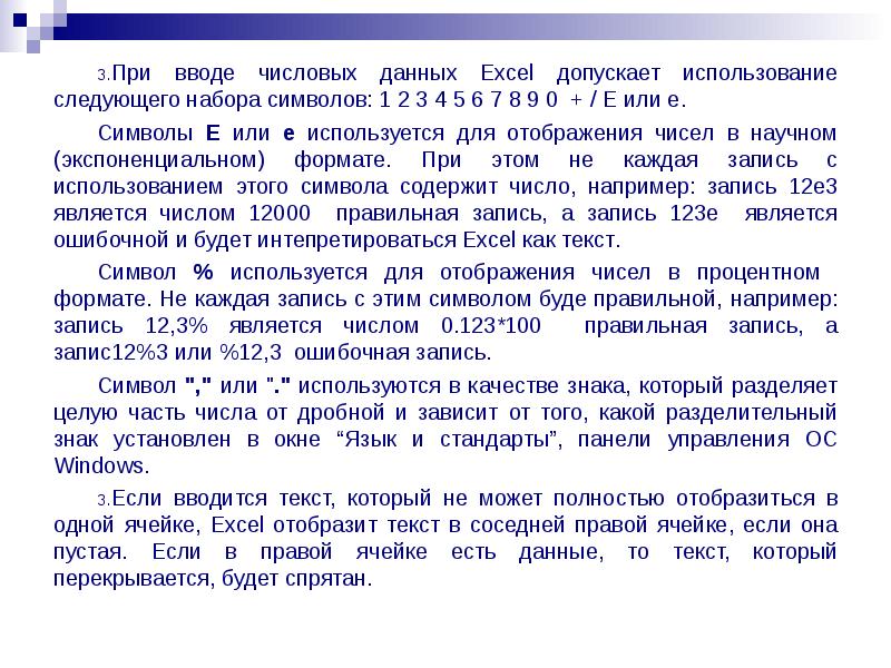 При вводе числовых данных Excel допускает использование следующего набора символов: 1 2 3 4 5 6 7 8 9 0 + / Е или е.