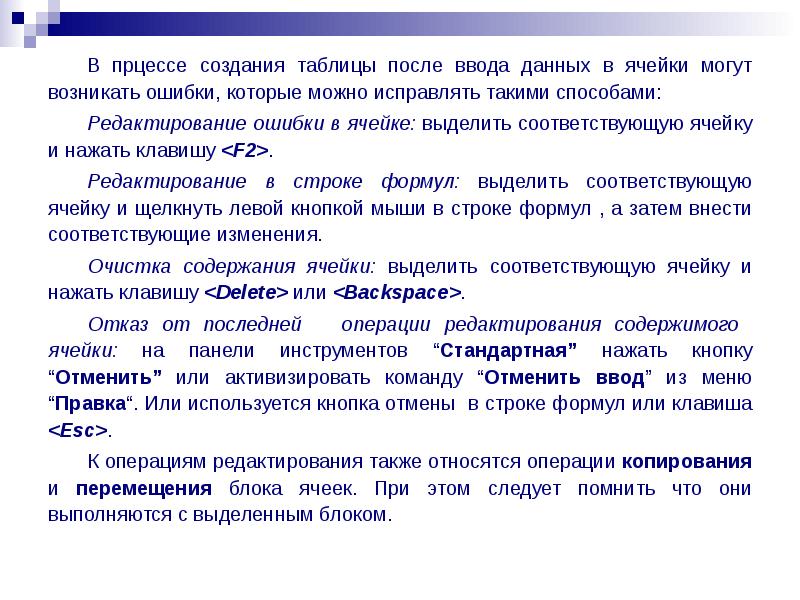 К операциям редактирования также относятся операции копирования и перемещения блока ячеек. При этом следует помнить что они выполняются с выделенным блоком.