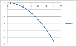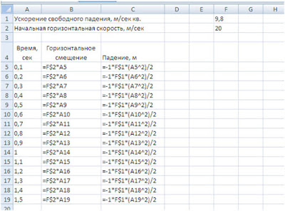 Решим задачу с помощью электронной таблицы. Выполним расчеты по шагам, разделив время падения на 15 интервалов по 0,1 с. При вычислении величины свободного падения все значений, как сказано выше, умножим на — 1, чтобы на диаграмме, свободное падение было направлено вниз.