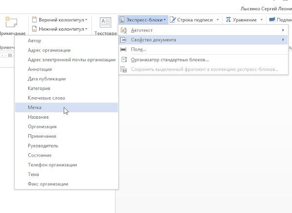 Открыв документ из библиотеки с помощью Word, нужно вывести поле в требуемом месте. На это место нужно установить курсор, перейти в ленточную панель «Вставка», в разделе «Текст» выбрать «Экспресс блоки». В выпадающем меню выбрать «Свойство документа» — «Метка».