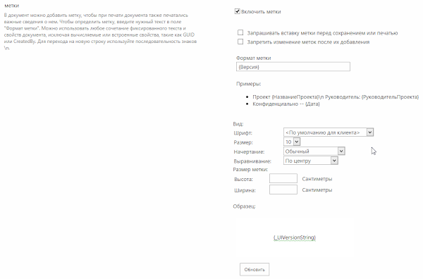 Чтобы в Word выводилась версия документа, нужно в поле «Формат метки» ввести {Версия}. Остальные поля можно менять по желанию. После нажатия на кнопку «Обновить» в поле «Образец» должна высветиться строка из скриншота. Если что-то пошло не так, ошибка будет выведена в самом верху страницы (придется листать, чтобы увидеть). На стороне SharePoint все готово, можно загрузить в библиотеку простой документ Word.