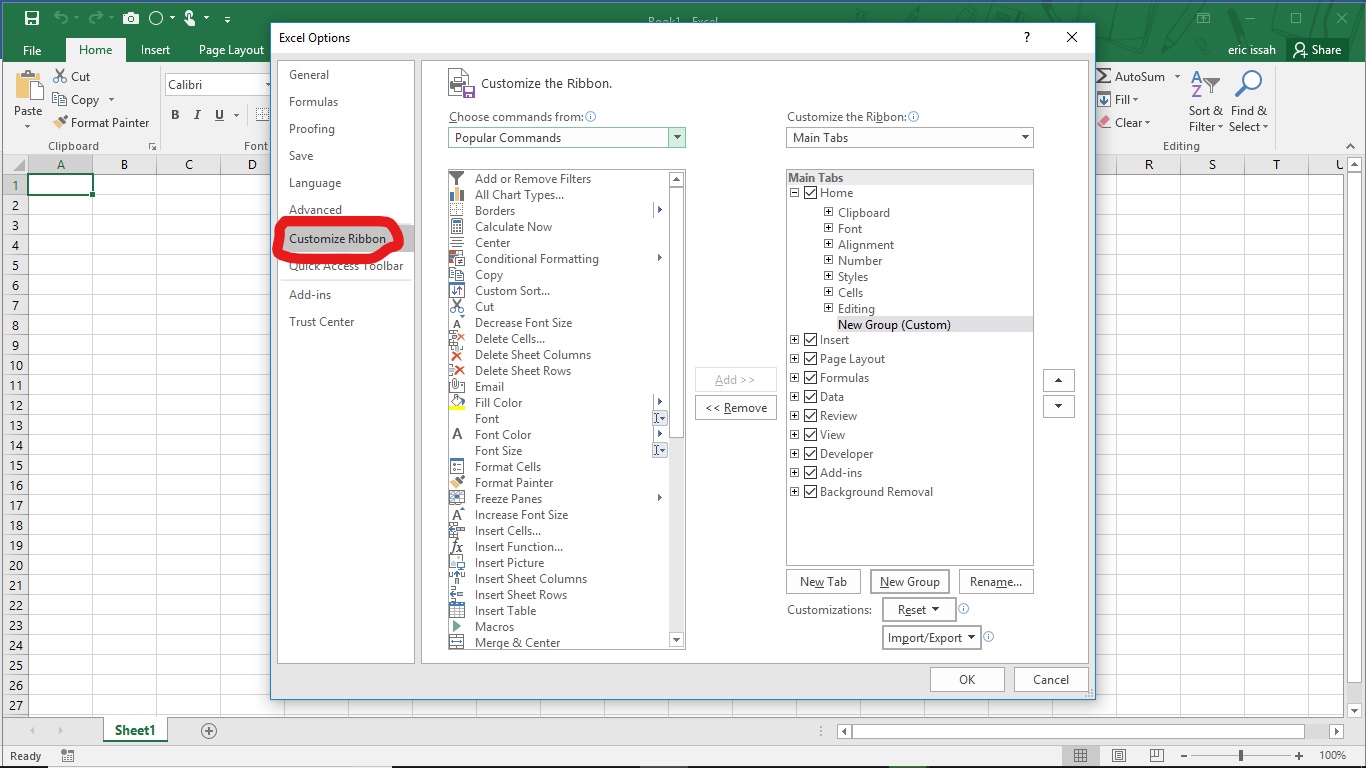 3. In the Customize Ribbons, click on New Group at the right bottom corner