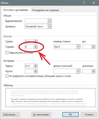 3. В открывшемся окне «Абзац«, в поле «Отступ справа» устанавливаем значение «0» и нажимаем кнопку «ОК«: