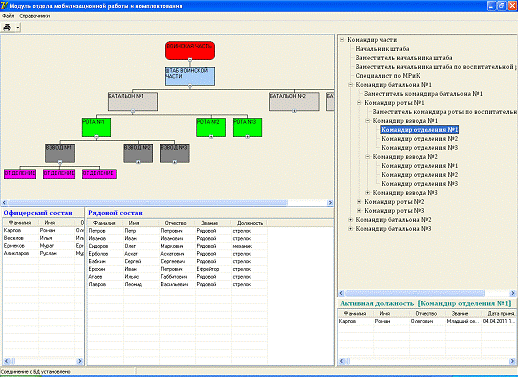 Кадровый учет военнослужащих — Позволяет вести штат части, вести необходимые кадровику данные на л/с, на основании введенных значений давать статистику по личному составу (штатную/списочную численность военнослужащих, список/количество вакантных должностей, женатых, холостых, у кого предельный возраст, у кого заканчивается контракт, кому необходимо новое звание, кто увольняется, кто в отпуске, в распоряжении и т.п… Получение отчетов по всем данным. Конфигурация легко и быстро настраивается под конкретные требования заказчика.