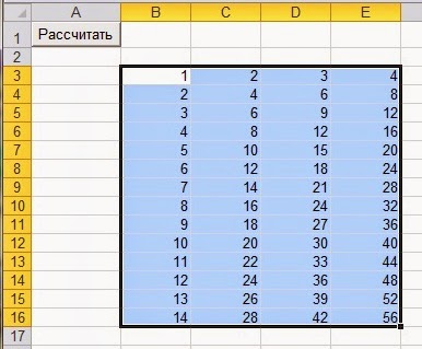 После этого выделенная область заполняется таблицей умножения. Первая колонка и первая строка выделенной области содержат числа, которые необходимо перемножить.