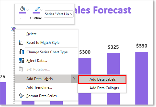 After you’ve re-jiggered your vertical line setup, you can then proceed to add a data label. Simply select your plotted dot and right-click on it. Then open the Add Data Labels menu and click Add Data Labels.