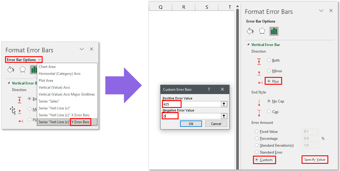 We will then turn on vertical Error Bars (margin of error indicators), repurposing them to visually display a vertical line on the chart.