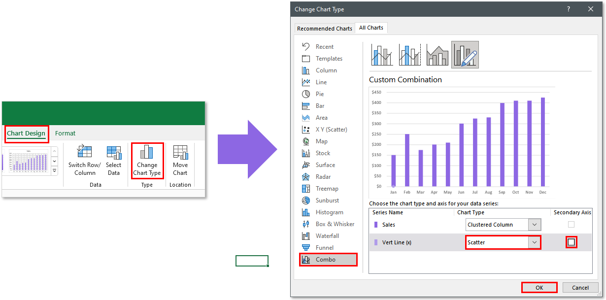 The vertical line will need to be plotted using a Scatter Plot chart. Chances are you are working with either a Bar Chart or a Line Chart, so we will need to turn your chart into a Combo Chart. Combo Charts can accommodate different charting types within a single Chart object.
