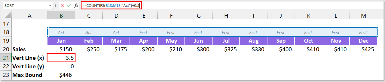 Looking at the data table, we can incorporate a simple COUNTIFS function to count how many months are designated as “Actuals”. This way, as the year progresses, the vertical line in the chart will move along as more and more months become “Actuals”.