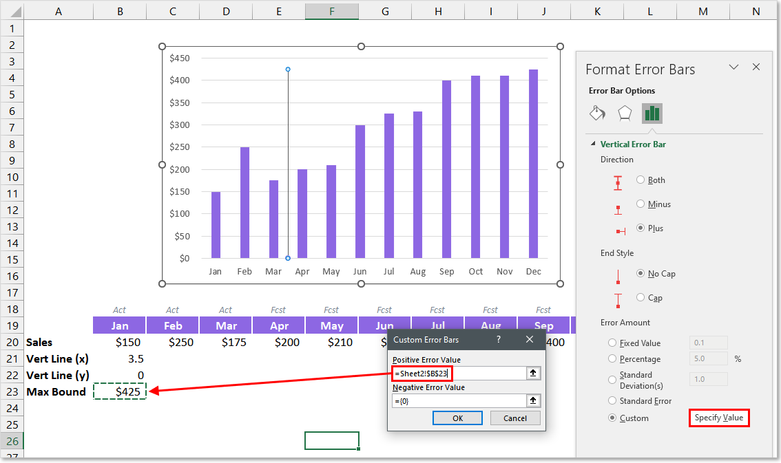 We can use this margin indicator line to our advantage and setup up the spreadsheet to allow us to draw a vertical line right on the chart. To add an Error Bar you will need to follow the below steps.