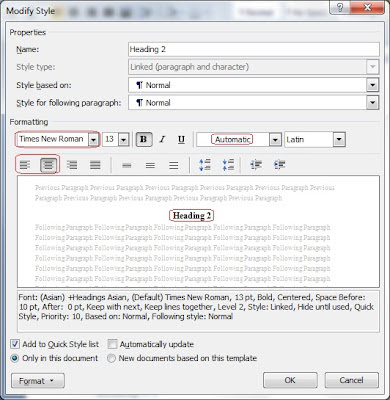 Select the desired formatting options on the Modify Style dialog box. Use the Format button to access more options to set. Click OK when you are finished changing the formatting. You are returned to the Manage Styles dialog box. Click OK to close it.