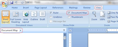 The Document Map in Word 2007 provides easy navigation in long documents. You can jump around your document by headings or pages. It also provides a bird’s-eye view of your document’s structure.