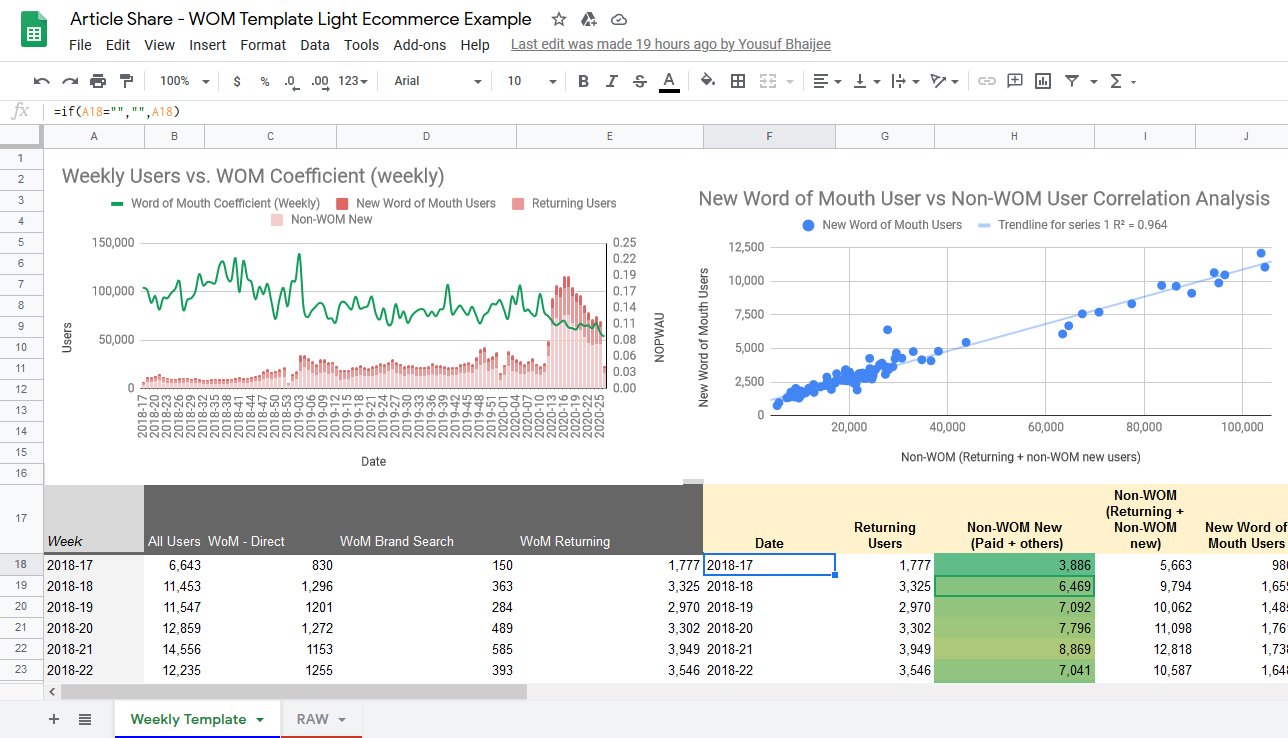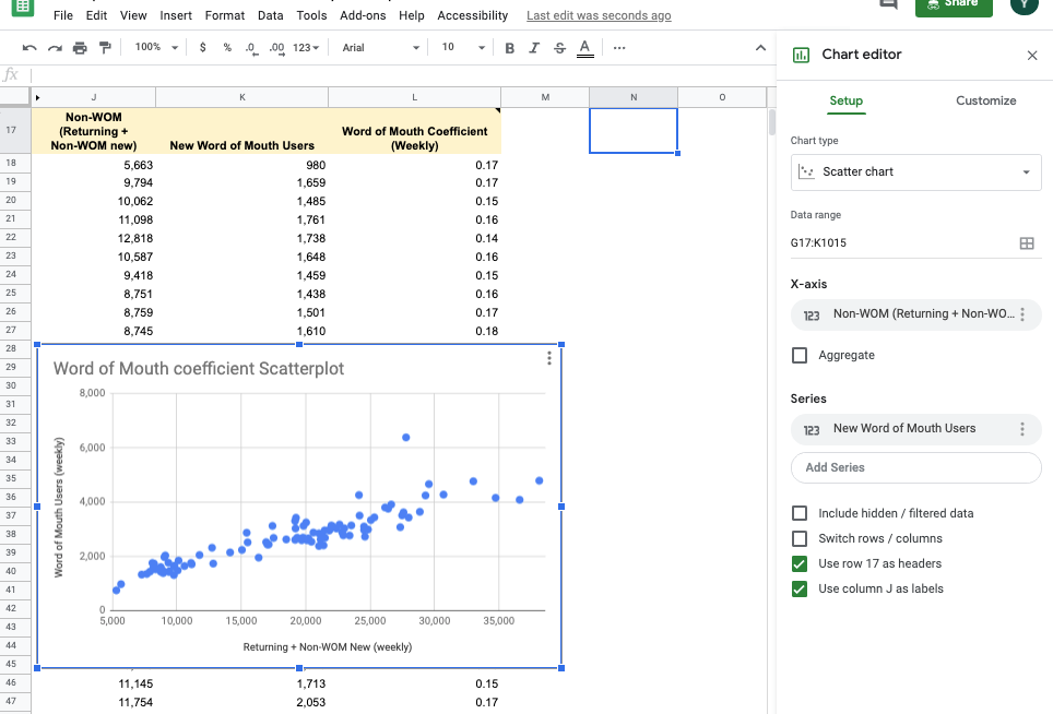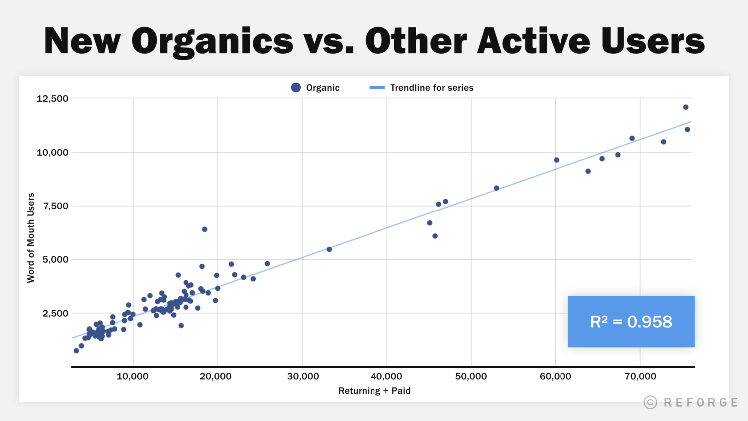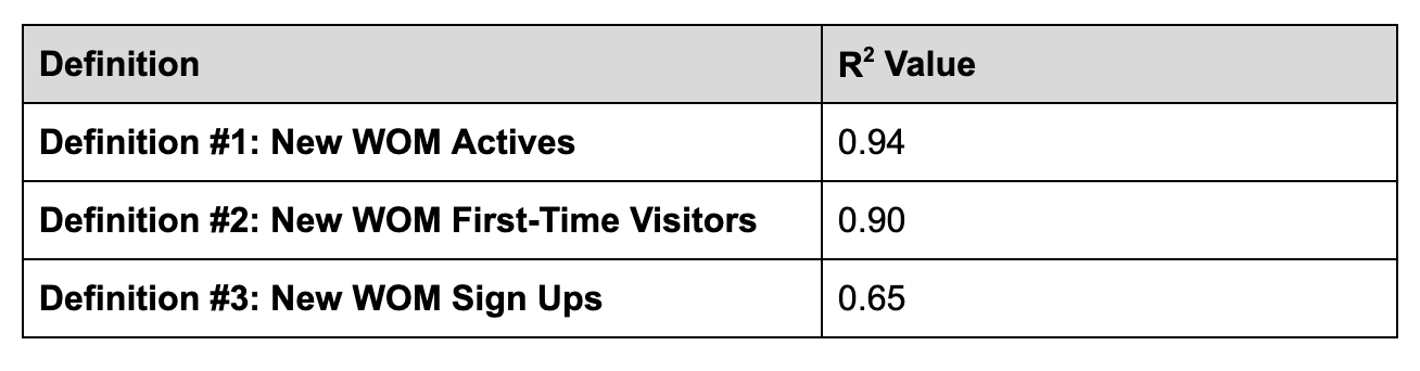 One of the key assumptions for the WOM Coefficient is that active users are predictive of new word of mouth users. To test that assumption, we will do a simple correlation analysis. If the R^2 is high (close to 1) then we know that we can use the metric to forecast goals that are realistic. If it is low, then we know that we need to do some additional refinement (which we’ll talk about later).