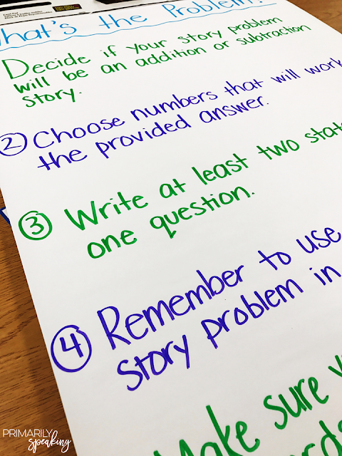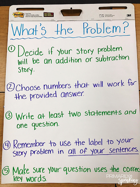 Once we go over the chart, we write at least one word problem together, using the mini book from above and the chart to guide us. Then, I have the students work in pairs to write a second word problem. I check their stories as they finish. Finally, the students write one word problem independently. Again, I check it when they are finished writing because I like to help them make any necessary corrections/changes on the spot.