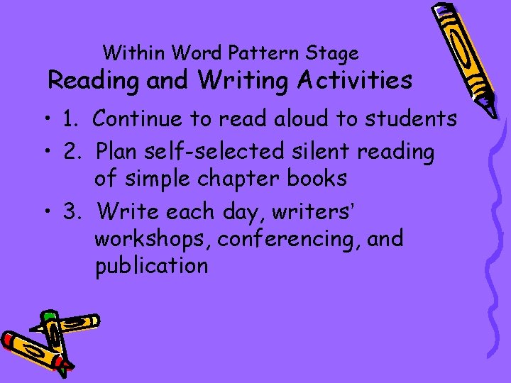 Within Word Pattern Stage Reading and Writing Activities • 1. Continue to read aloud to students • 2. Plan self-selected silent reading of simple chapter books • 3. Write each day, writers’ workshops, conferencing, and publication