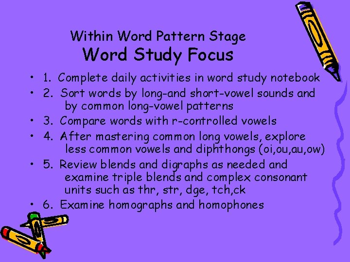 Within Word Pattern Stage Word Study Focus • 1. Complete daily activities in word study notebook • 2. Sort words by long-and short-vowel sounds and by common long-vowel patterns • 3. Compare words with r-controlled vowels • 4. After mastering common long vowels, explore less common vowels and diphthongs (oi, ou, au, ow) • 5. Review blends and digraphs as needed and examine triple blends and complex consonant units such as thr, str, dge, tch, ck • 6. Examine homographs and homophones