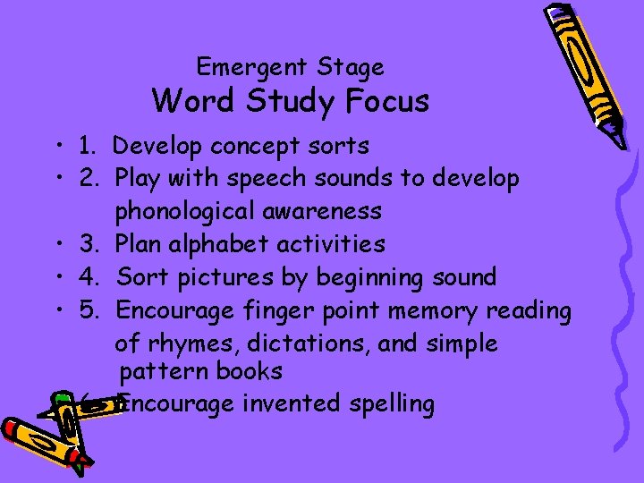 Emergent Stage Word Study Focus • 1. Develop concept sorts • 2. Play with speech sounds to develop phonological awareness • 3. Plan alphabet activities • 4. Sort pictures by beginning sound • 5. Encourage finger point memory reading of rhymes, dictations, and simple pattern books • 6. Encourage invented spelling