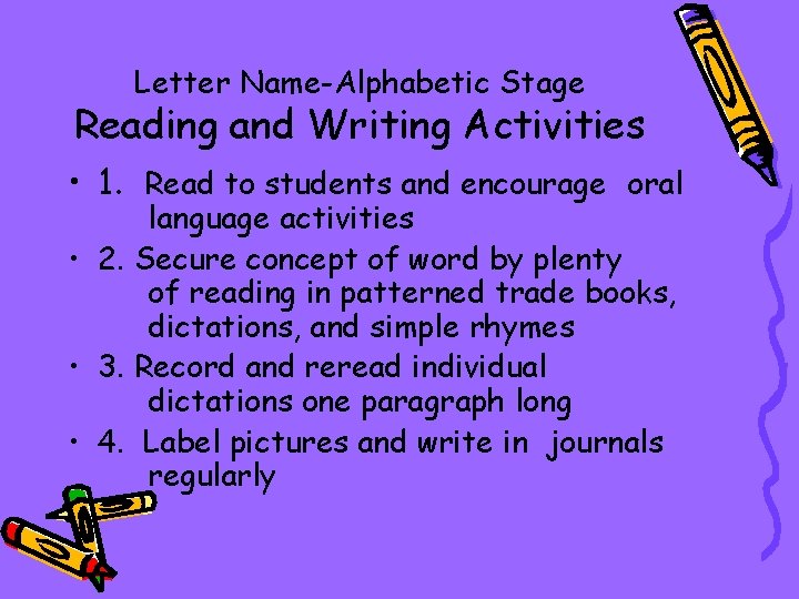 Letter Name-Alphabetic Stage Reading and Writing Activities • 1. Read to students and encourage oral language activities • 2. Secure concept of word by plenty of reading in patterned trade books, dictations, and simple rhymes • 3. Record and reread individual dictations one paragraph long • 4. Label pictures and write in journals regularly
