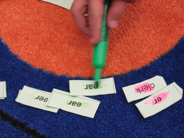 Tuesday—During morning work, I call each group back to the rug and introduce their sort for the week. They highlight the category cards and one exemplar for each category. I think it helps them remember their categories better. Then they take their words back to their desks to sort and write.