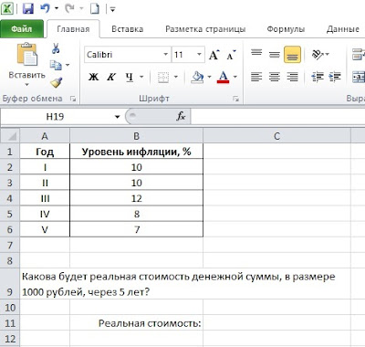 Имеются прогнозные данные о возможном уровне инфляции на протяжении следующих 5 лет. Необходимо определить, какова будет реальная стоимость денежной суммы, в размере 1000 руб. через 5 лет? Исходные данные приведены на рис. 6.