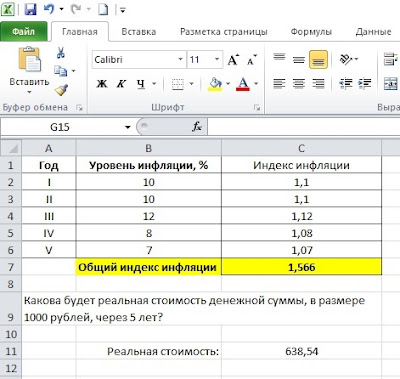 В ячейке С11 рассчитываем реальную стоимость 1000 руб., как 1000 / 1,566 = 638,54 руб. Соответствующие результаты расчетов приведены на рис. 7.